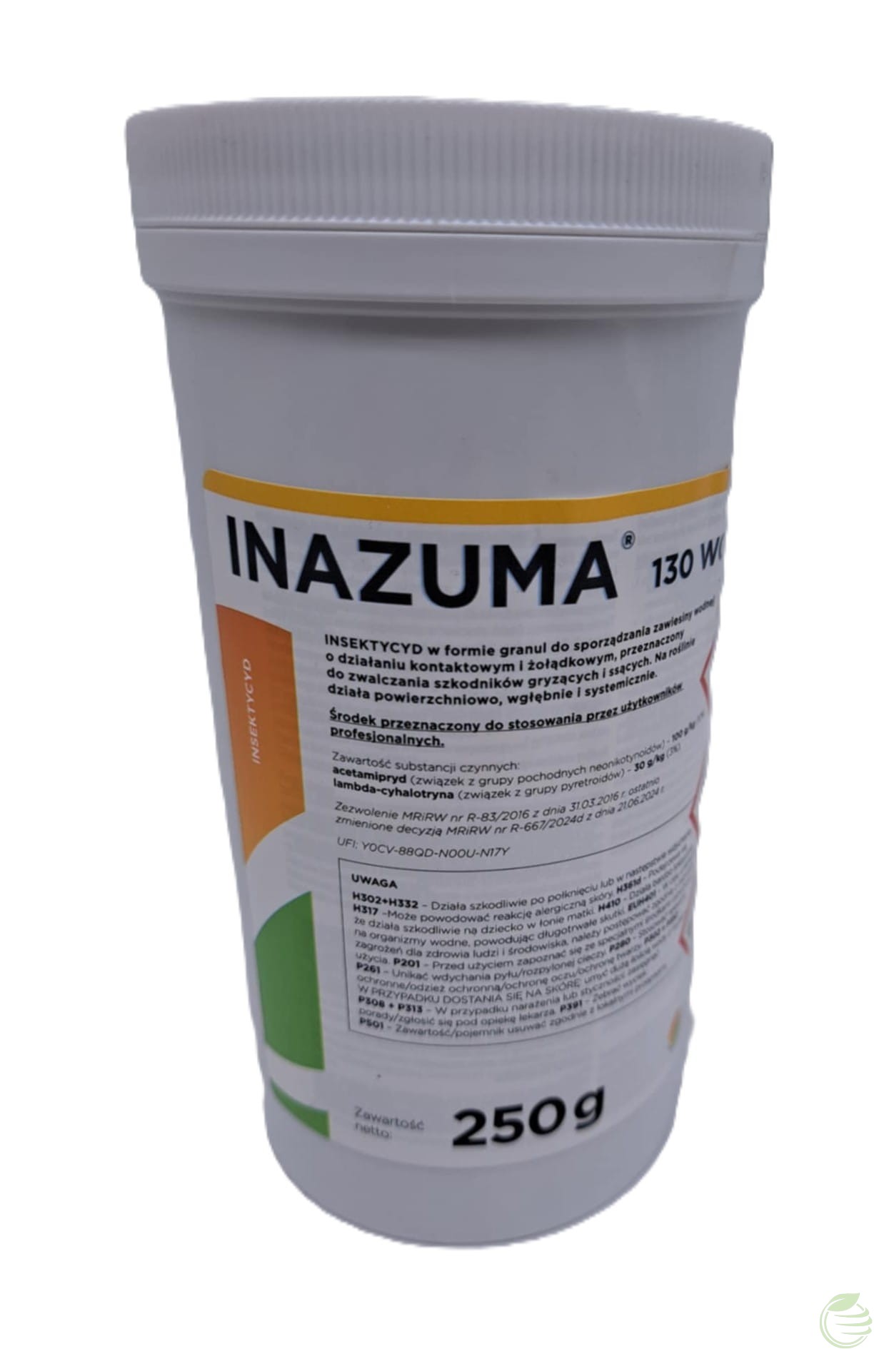 Środek owadobójczy w formie gotowej mieszaniny dwóch substancji czynnych w postaci granul do sporządzania zawiesiny wodnej. Środek o działaniu kontaktowym i żołądkowym przeznaczony jest do zwalczania szkodników gryzących i ssących. Na roślinie działa powierzchniowo, wgłębnie, a także systemicznie. Powoduje natychmiastową śmierć szkodników i zapewnia długotrwałą ochronę plantacji. Działa skutecznie nawet w niesprzyjających warunkach pogodowych, a także w szerokim zakresie temperatur (już od 5°C). Dzięki temu  Inazuma 130 WG doskonale nadaje się do zabiegów wczesnowiosennych. Środek należy stosować przy użyciu samobieżnych lub ciągnikowych opryskiwaczy polowych i sadowniczych oraz opryskiwaczy ręcznych.